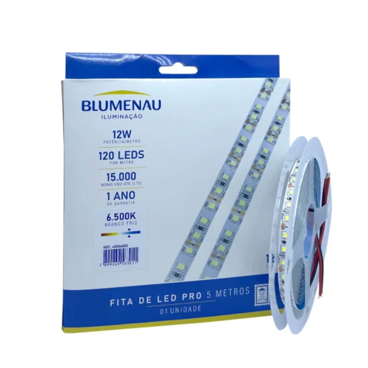A Fita de LED PRO da Blumenau possui 5 metros de comprimento, opera em 12V e consome 12W por metro, oferecendo iluminação em branco frio (6500K), ideal para ambientes internos que exigem luz clara e intensa. Com 120 LEDs por metro, proporciona excelente distribuição de luz, sendo uma solução eficiente e econômica para projetos de iluminação decorativa ou funcional.